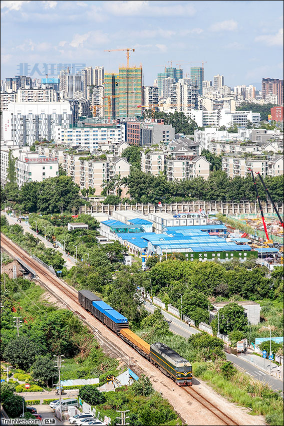 2021年7月。小运转货列行驶在繁华的深圳龙华。