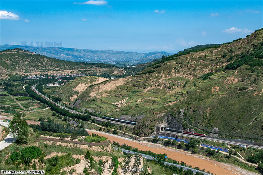 2021年7月20日。陇海线。双机SS7E牵引K6663次(天水-兰州)行驶在天水卦台山下,通过渭河河谷。