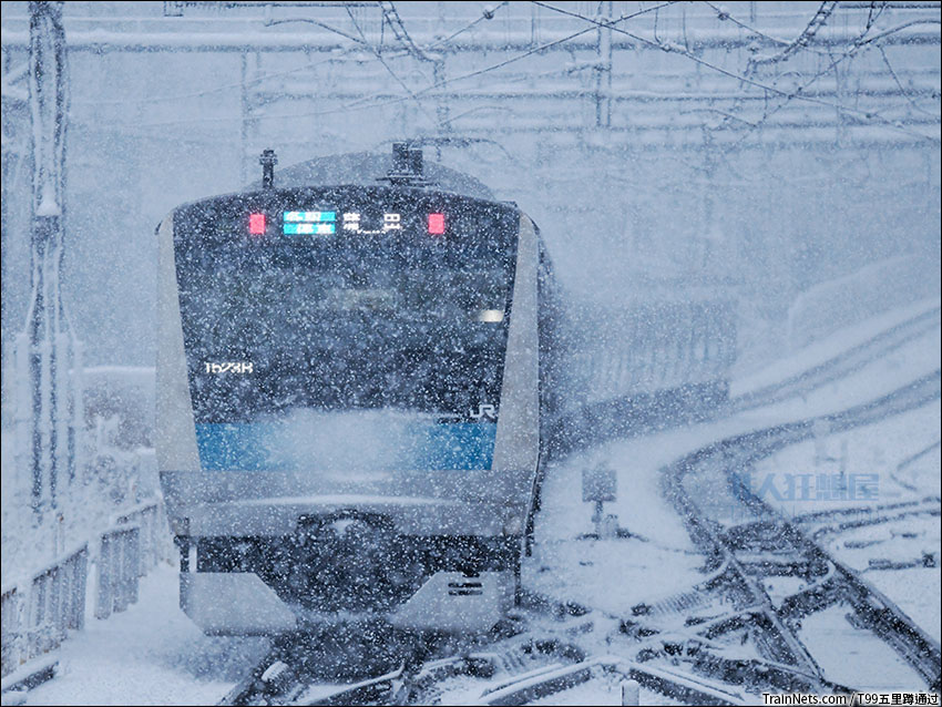 2022年1月6日,京滨东北线E233系电车在傍晚的大雪中离开田端站。