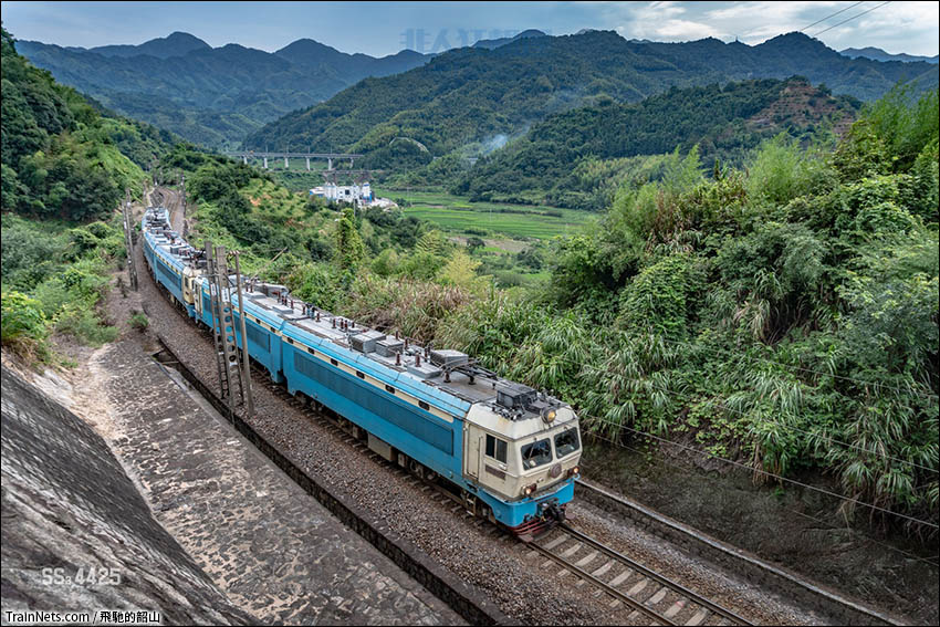 2021年8月20日,鹰厦铁路下行线,三台韶山4通过打虎坑展线接近打虎坑站。