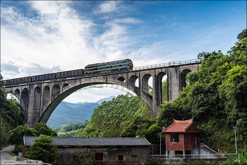 2021年8月26日,漳龙铁路上行线,广铁龙段4B牵引货列通过罕见的大拱桥前往龙岩。