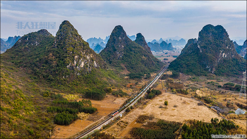 2021年2月。广西贺州。T82次(南宁-上海南)行驶在洛湛线上,穿行在桂东北的喀斯特群山中。