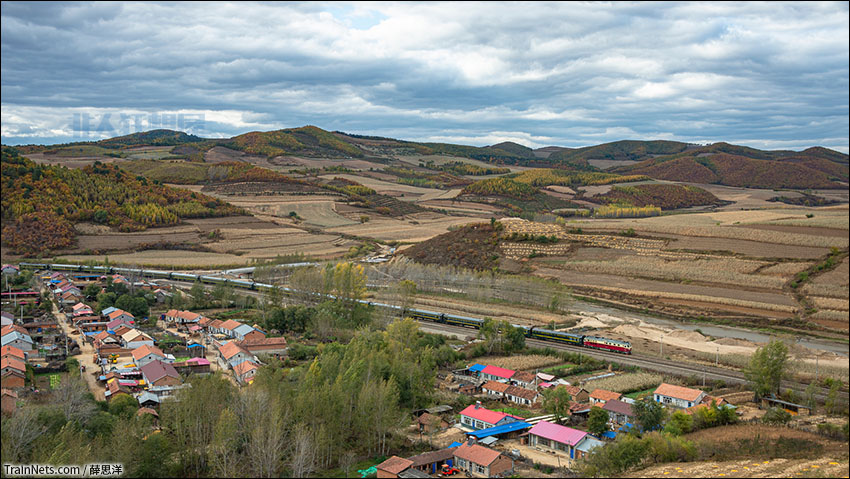 2017年10月。K7051次(牡丹江-林口)行驶在秋日图佳线朱家沟村庄旁的丘陵区。