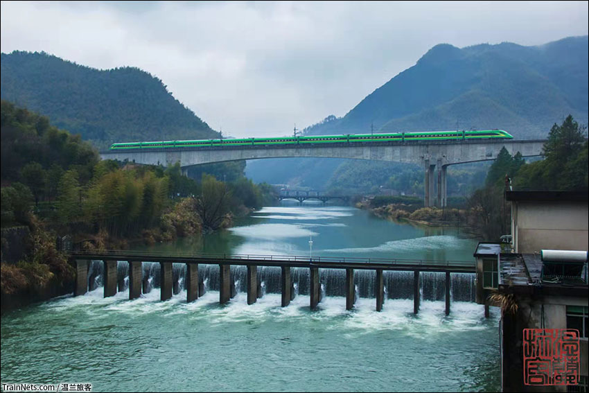 2022年2月。衢宁线。雨水节气,C481次(上海南-庆元)列车穿行在龙游县沐尘畲族乡境内春潮初涨的灵山港河谷。