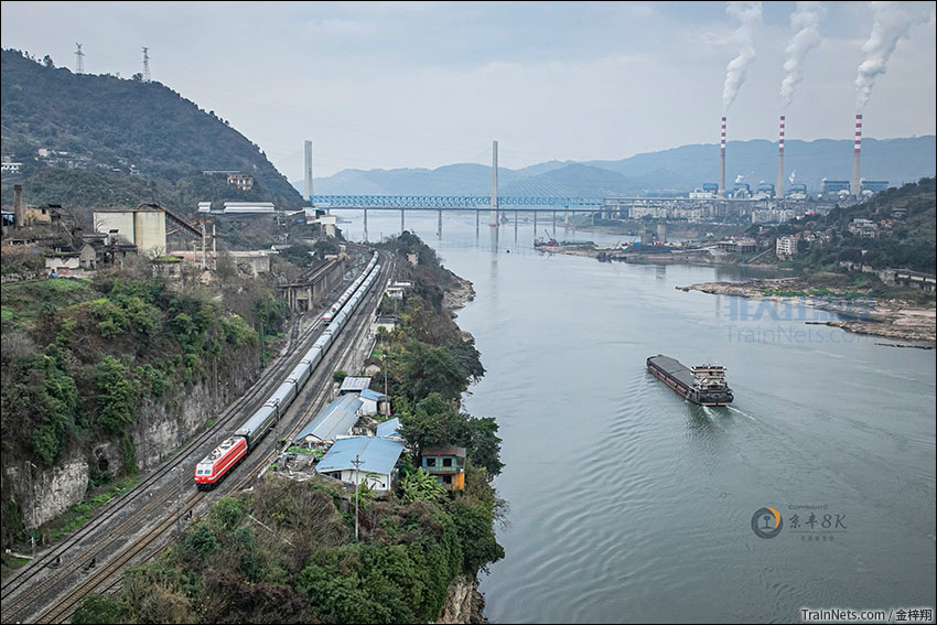 2022年2月。成渝线。石场站。江上货运轮船遇上沿江而行的客车。