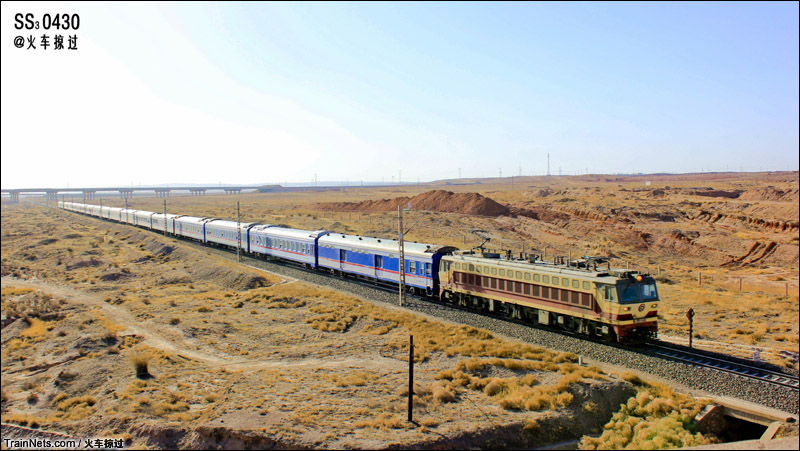 2015年2月。包兰铁路青铜峡-青分区间。SS7C与25K组合,T178次,乌鲁木齐南-北京行驶在茫茫戈壁上。