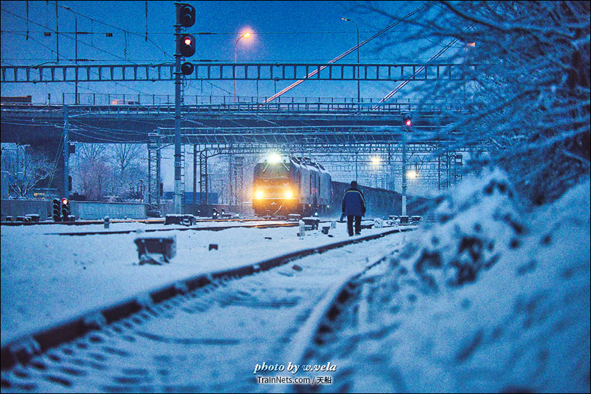 2022年3月18日。京城迎来大雪,HXD2牵引货列缓缓驶出石景山南站。