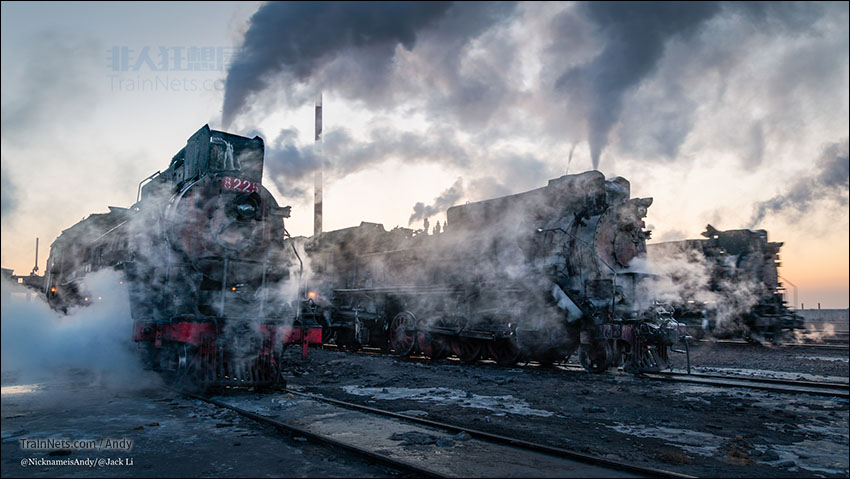 2022年农历新年清晨,新疆哈密三道岭镇,在露天矿忙碌了一夜的蒸汽机车们齐齐回到东剥离站内进行整备,而此时也是一整天里最为热闹的时刻,一列早已回到东剥离站整备的夜班车组与隔壁热备了一夜的热备车组同框,恰好远处最后一趟夜班车组也回到了站内整备,就这样,三台蒸汽机车齐聚东剥离站。
