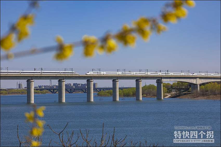 2022年4月2日。北京永定河森林公园。G503次(北京西-长沙南)和D2004次(运城北-北京西)交汇于京广高铁永定河大桥。