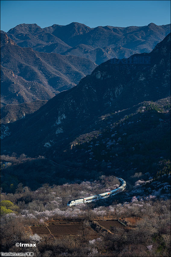 2022年4月。北京市郊铁路S251次(延庆-黄土店)列车行驶在居庸关山谷内,山坡上的桃花正在绽放。