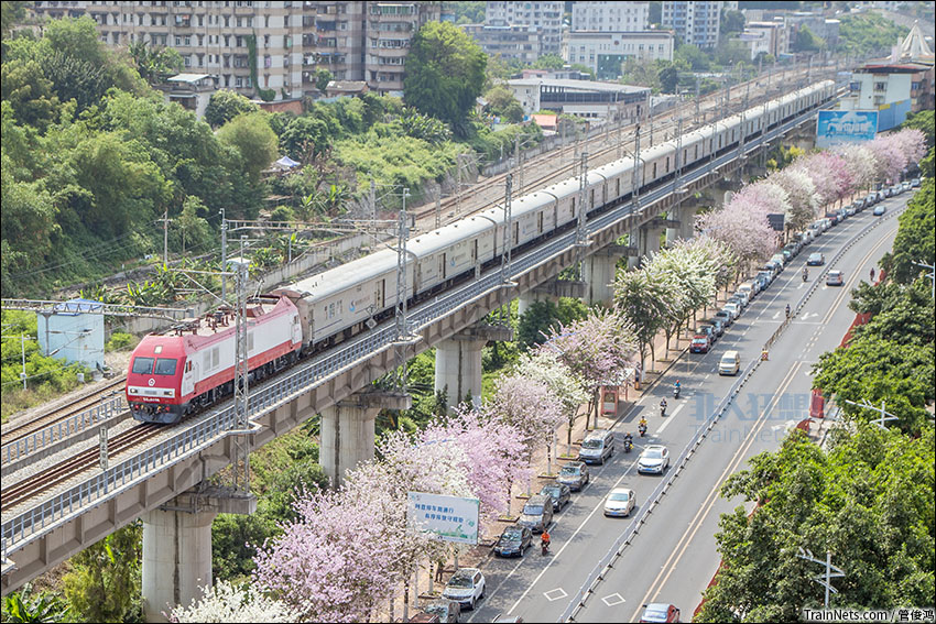 2022年4月12日。X116次行邮班列通过正盛开紫荆花的韶关启明北路。