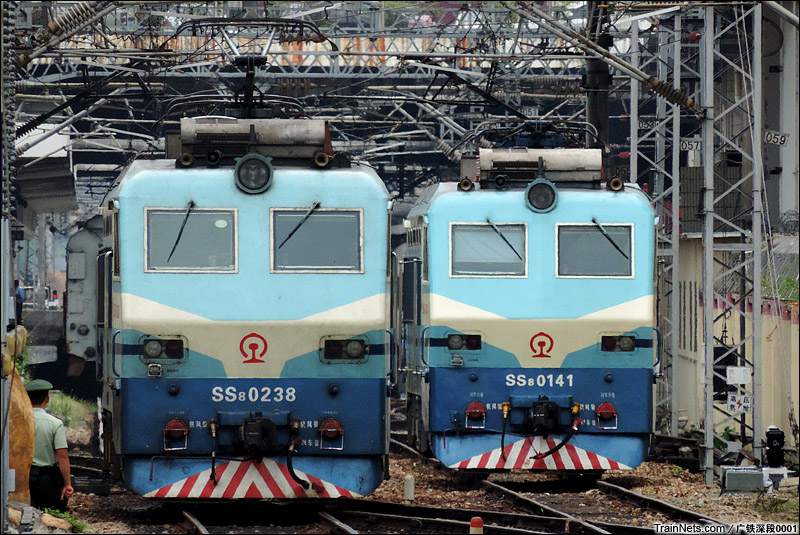 2015年5月10日。香港罗湖站。从香港眺望深圳站,休息的SS8-0141与刚刚解挂的0238相遇。