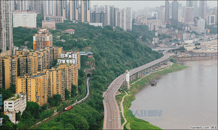 2021年4月。重庆。成渝线,K679次驶出竹木街隧道,半山错落着交通街和竹园小区,隧道另一头是菜园坝站、小商品、灯饰城、水果批发市场。
