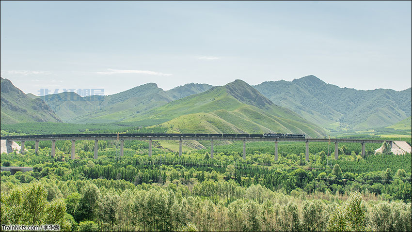 2022年7月30日,集通铁路。集通大段双机DF8B牵引煤炭大列满功率通过司明义展线,上店站接近。经棚-上店区间重车加挂补机冲坡,内燃机车的嘶吼声回荡在群山之间,场面颇为壮观。
