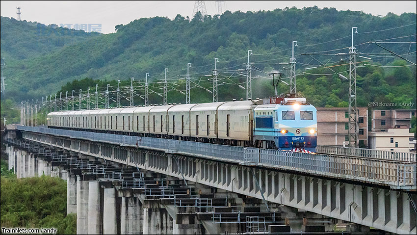 2022年5月15日。傍晚18:47,达速运行在赣韶线上的韶八行包专列X115次列车快速通过雨后的腊石坝大桥,受电弓将积在接触网上的雨水刮开形成雨后电气化铁路上独有的“刮水”景象。