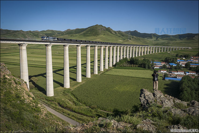 2022年8月20日,赤大白铁路巴根吐大桥,一列满载着煤炭的货运列车驶上大桥,一名铁路爱好者在山坡上拍摄这一瞬间。