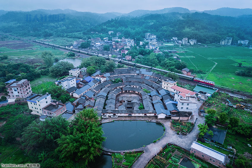 2022年5月,广梅汕铁路,广铁龙段东风4D牵引K6593次(梅州-深圳)从客家特色建筑围龙屋后方驶过,接近兴宁站。