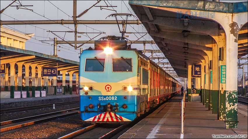 2008年12月。夕阳下的松江站,SS8牵引客车通过。
