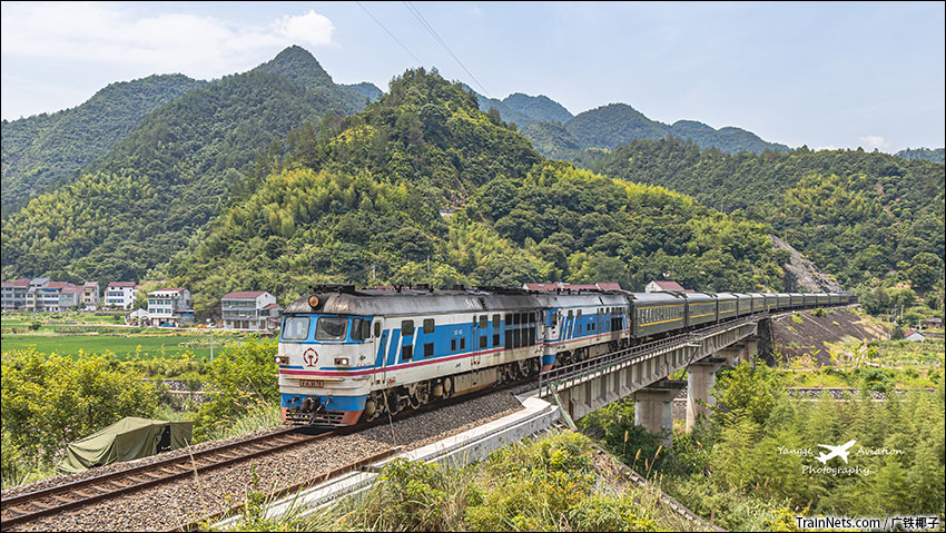 2022年7月15日,金温铁路。金温4B+4D双机牵引下行客车通过丽水市青田县官坑村。