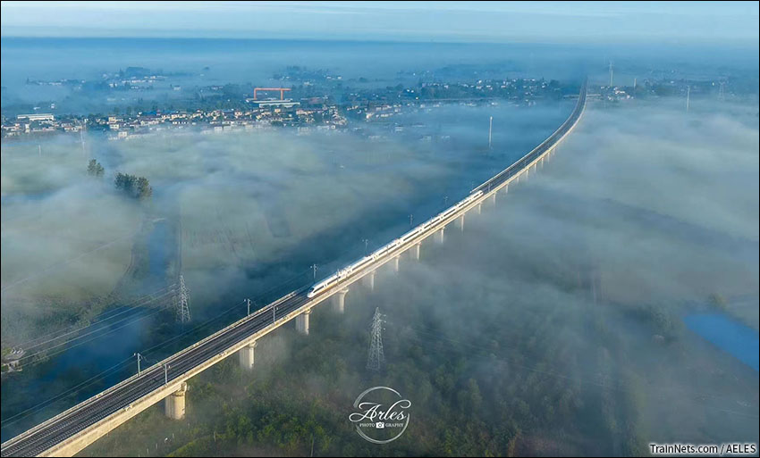2022年10月。清晨的连镇高铁,线路旁笼罩着层层薄雾,一列高铁列车在雾气中穿行而过。