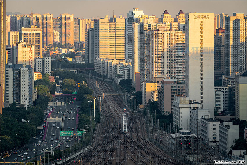 2022年10月23日,广深线,伴着夕阳而过的“大地铁”驶向广州东站。