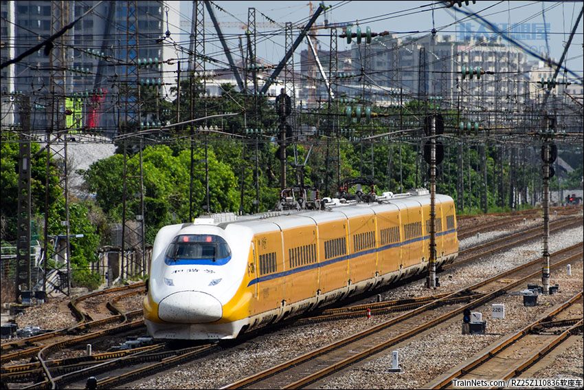 2021年7月11日,京广线,CRH2J高速综合检测车通过棠溪北场,远处是正在建设的新白云枢纽,塔吊林立。
