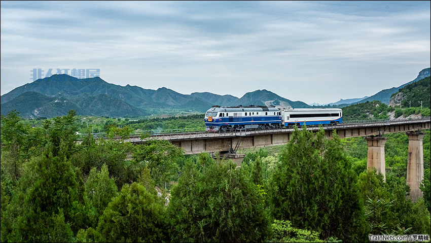 2022年5月6日。北京。京原铁路。DF11-0128“先锋号”机车牵引检测车接近云居寺站。