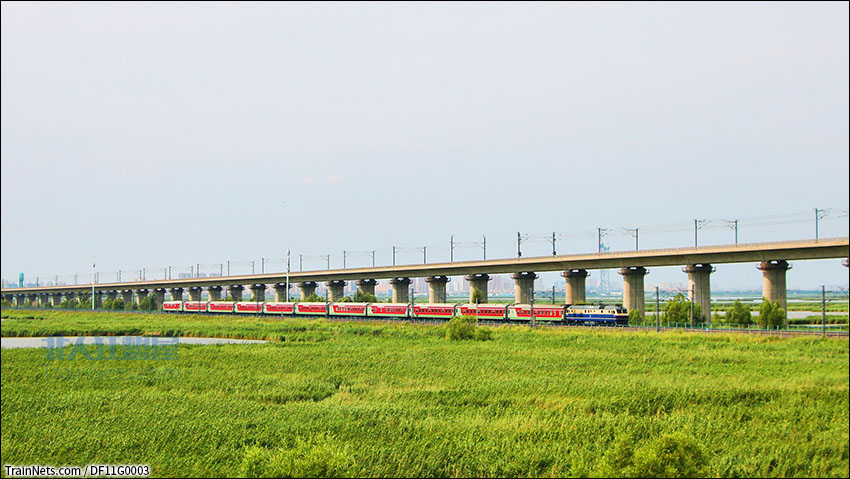 2022年08月04日。滨洲线。碧绿的芦苇荡旁,呼伦贝尔号旅游列车呼啸而过。