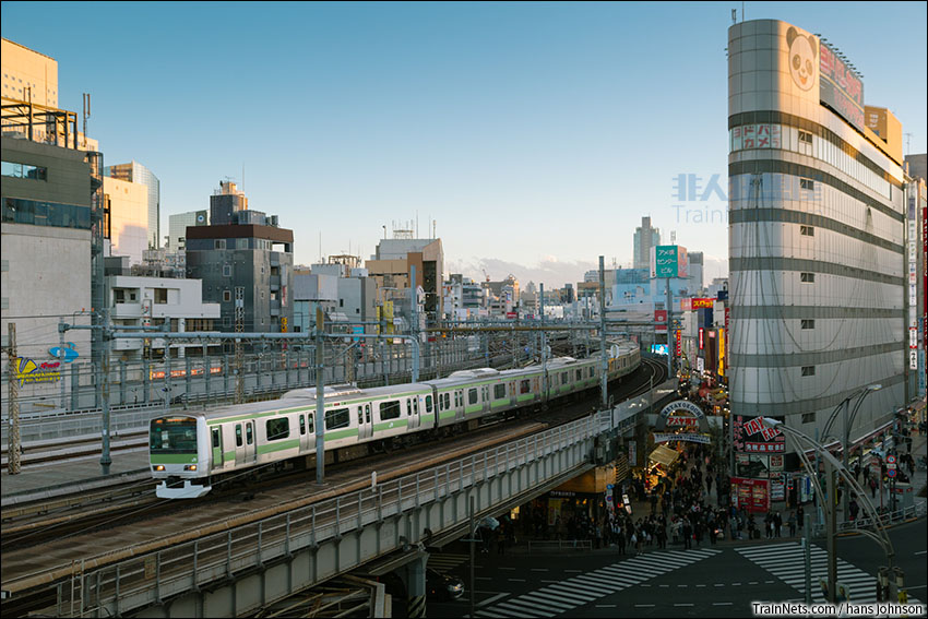 2017年12月27日,日本东京都台东区,山手线E231系列车在上野闹市之间穿行。