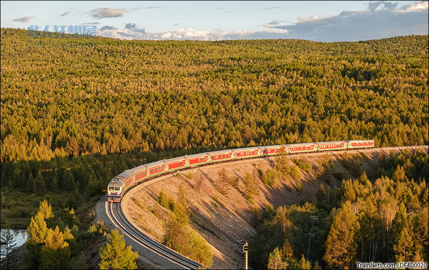 2022年8月28日。牙林线。日落时分,哈局三段DF11牵引呼伦贝尔号通过岭北大弯道前往根河站。虽然叶子未红但正因日落,夕阳将树叶染红,也算无心插柳柳成荫。