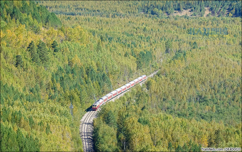 2022年8月29日。嫩林线。上午,DF4D牵引呼伦贝尔号行驶在大兴安岭的密林之间。