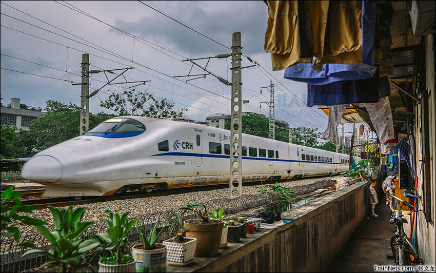 2022年6月。南来北往,不辜负生活,不迷失方向,“你说,住在铁路旁的孩子会不会耳濡目染呢?”——阴天下的广州,南宁铁路局担当的D3666次(深圳-柳州)穿过广州的城寨,行驶在广茂铁路上。