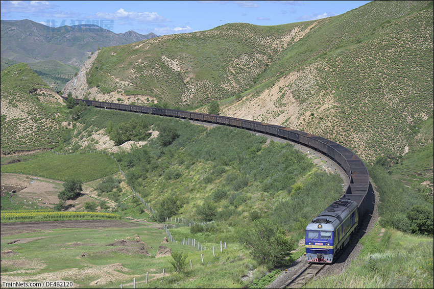 2022年8月,集通线DF8B牵引空敞大列通过二地展线接近上地车站。