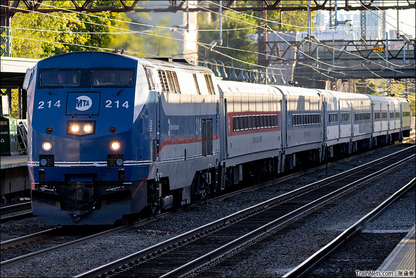 2022年8月,美铁东北走廊,Metro North通勤铁路New Haven线的内燃机牵引列车北行通过Larchmont车站。