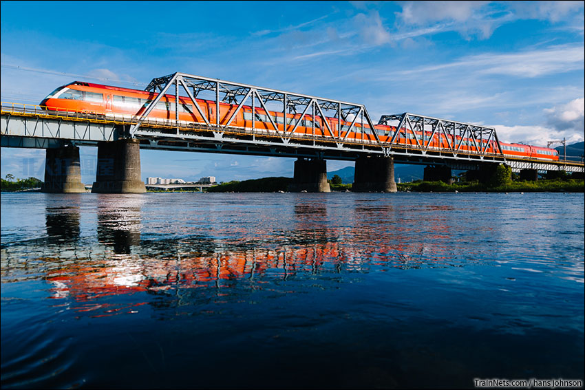 2018年6月30日,日本神奈川县松田町,小田急浪漫特快70000系GSE列车跨越酒匂川。作为最新一代浪漫特快,GSE虽然抛弃了铰接式转向架,但延续了展望席,将这一广受喜爱的特点传承下去。