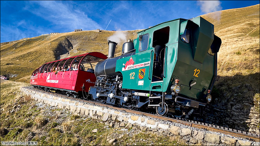 2022年10月16日,瑞士布里恩茨-洛特峰登山铁路。全长仅7.6公里,却从海拔566米的布里恩茨站急剧爬升至海拔2244米的洛特峰山顶站,高差达1678米。该线路采用800mm轨距的齿轮轨道,最大坡度千分之250。目前有蒸汽机车进行日常运转,图片中的机车为1992-1996年生产的H2/3型蒸汽机车,燃料为燃油,90后“蒸爷”。因整条线路几乎全为坡道,为保持水面平衡防止干烧,蒸汽机车与转向架存在一定的角度。