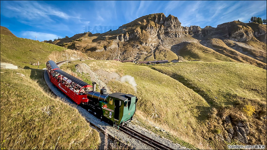 2022年10月16日,瑞士布里恩茨-洛特峰登山铁路。全长仅7.6公里,却从海拔566米的布里恩茨站急剧爬升至海拔2244米的洛特峰山顶站,高差达1678米。该线路采用800mm轨距的齿轮轨道,最大坡度千分之250。目前有蒸汽机车进行日常运转,图片中的机车为1992-1996年生产的H2/3型蒸汽机车,燃料为燃油,90后“蒸爷”。因整条线路几乎全为坡道,为保持水面平衡防止干烧,蒸汽机车与转向架存在一定的角度。