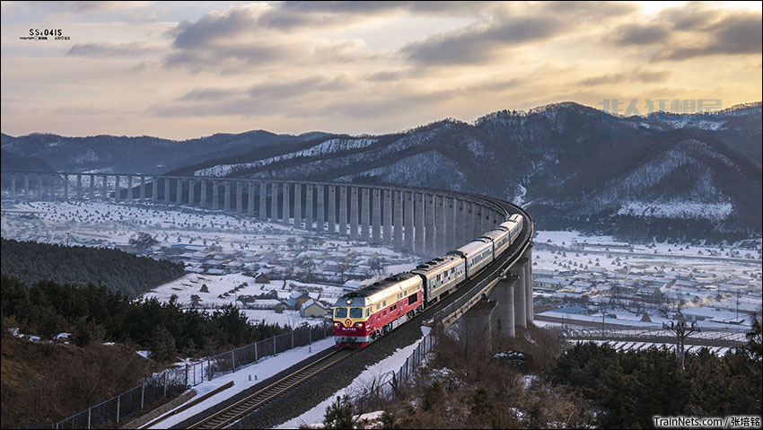 2022年1月13日,吉林通化,4318次(通化-丹东)在日出时刻行驶在通灌线大泉源村的晨炊之上。