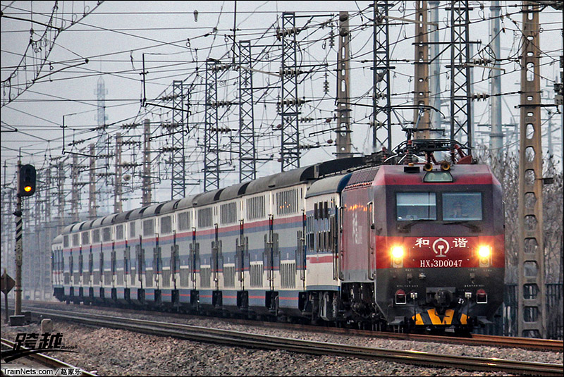 2015年3月15日。京广线。柳辛庄站。西安局HXD3D牵引双层客车T55次,天津-宝鸡。(图/赵家乐)