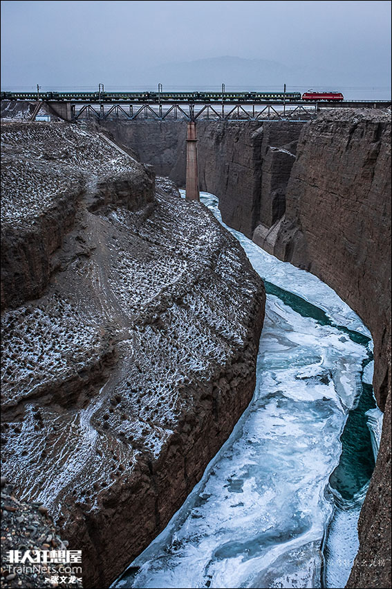 2023年1月。铁马冰河入梦来,蓝调时刻下的嘉峪关,兰局兰段SS7E牵引7530次(镜铁山-嘉峪关)驶出祁连山脉,行驶在嘉镜铁路北大河一号桥上,即将到达桥西站,这里也是冯小刚导演《天下无贼》的取景地之一。