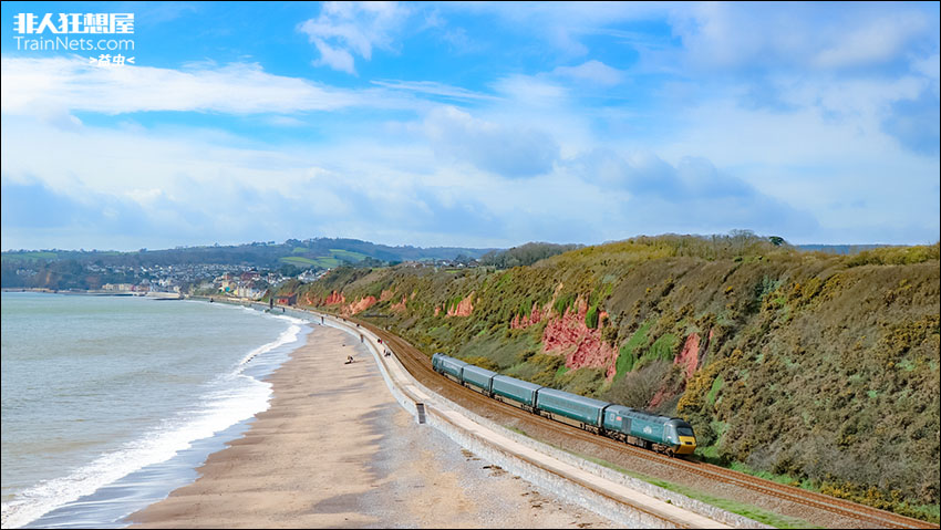 2022年8月。GWR class43牵引Penzance至Cardiff Central的service驶过Dawilsh海滩。