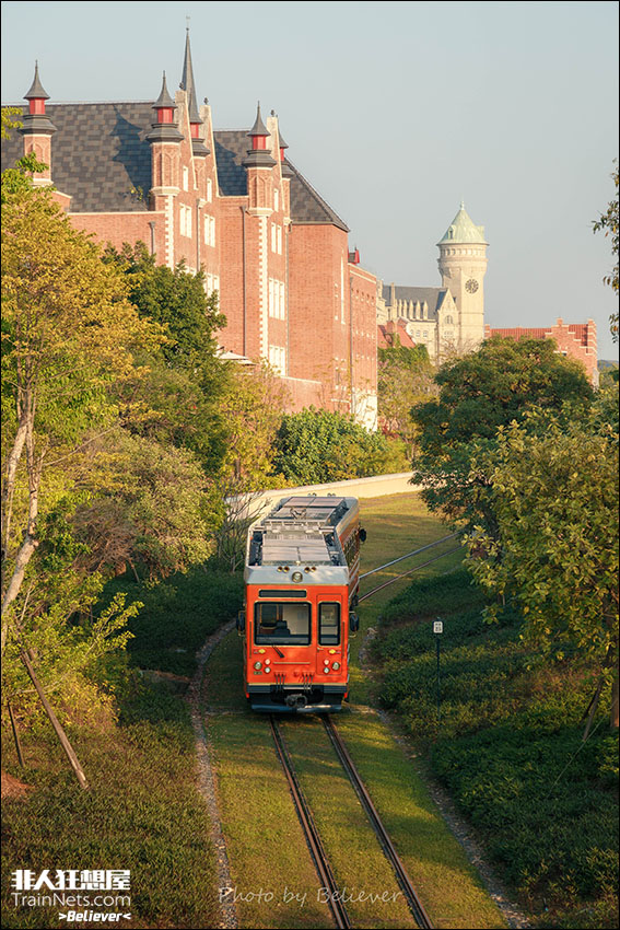 2022年12月。东莞松山湖,华为欧洲小镇有轨电车行驶在城堡下。