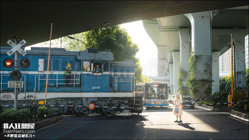 2022年4月,武汉马鹦路道口,武汉神龙公司专用线,DF7型机车拉着煤炭敞车通过道口,女友好奇地注视着火车。
