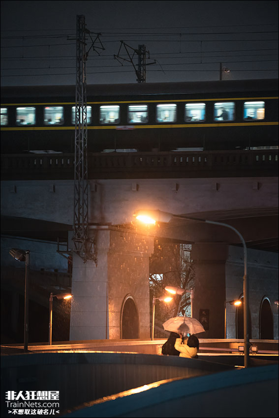 2022年1月,武汉司门口,和女友打着伞走过路灯下,背后北上的列车正在驶上武汉长江大桥。
