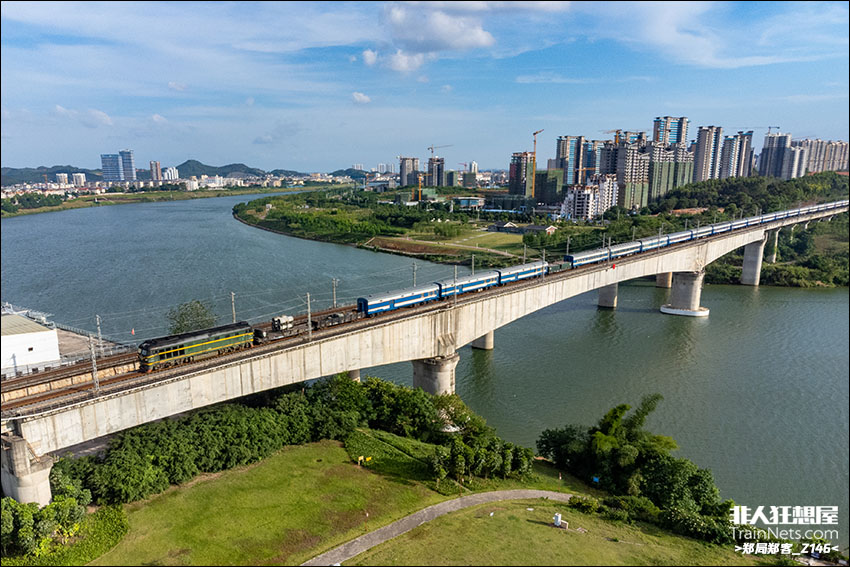 2023年5月,南宁局宿营大列57606次通过邕江大桥。