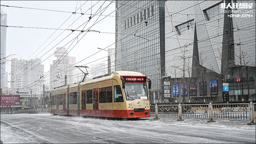 2023年1月24日。大连201路区间,大连人牌DL6WA型有轨电车吹起积雪。