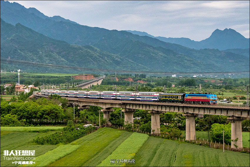2023年4月27日。西康线。SS7D牵引的双层T7014次(安康-宝鸡)驶出秦岭,接近引镇站。