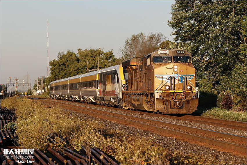 2022年8月6日,西门子加州工厂向加拿大国家客运铁路(Via Rail Canada)的第二列西门子Charger/Venture列车在美国联合太平洋铁路(Union Pacific Railroad) GE AC45CCTE UP 5275牵引下经过Coteau, QC。
