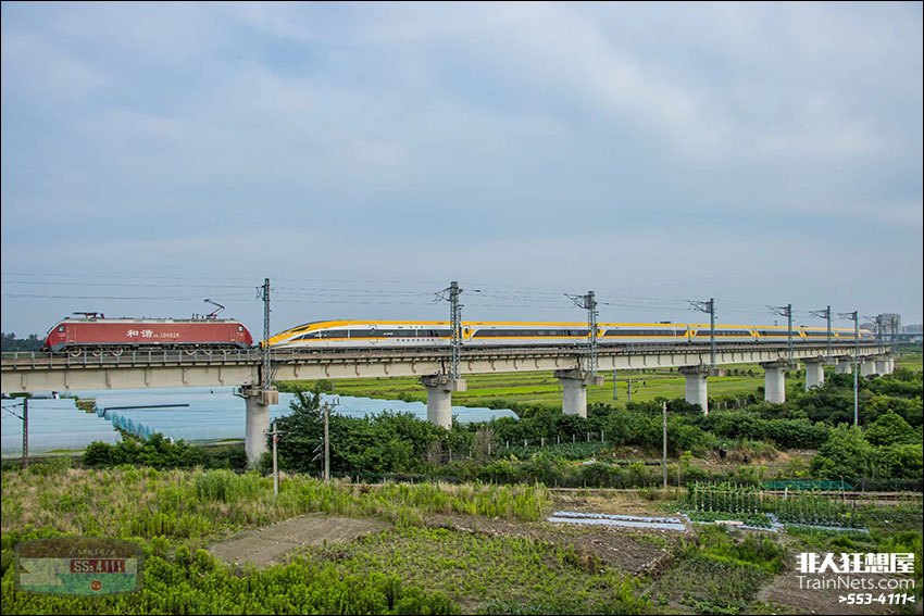 2023年6月12日,上海,初夏清晨,回送CR400AF-J的00135次驶过封黄联络线。