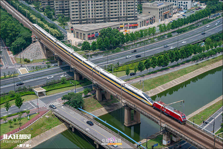 2023年6月11日。京沪线。00137次无火回送CR400BF-J高速综合检测列车驶上南京长江大桥引桥。